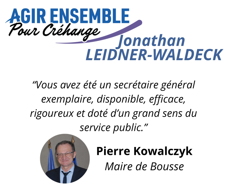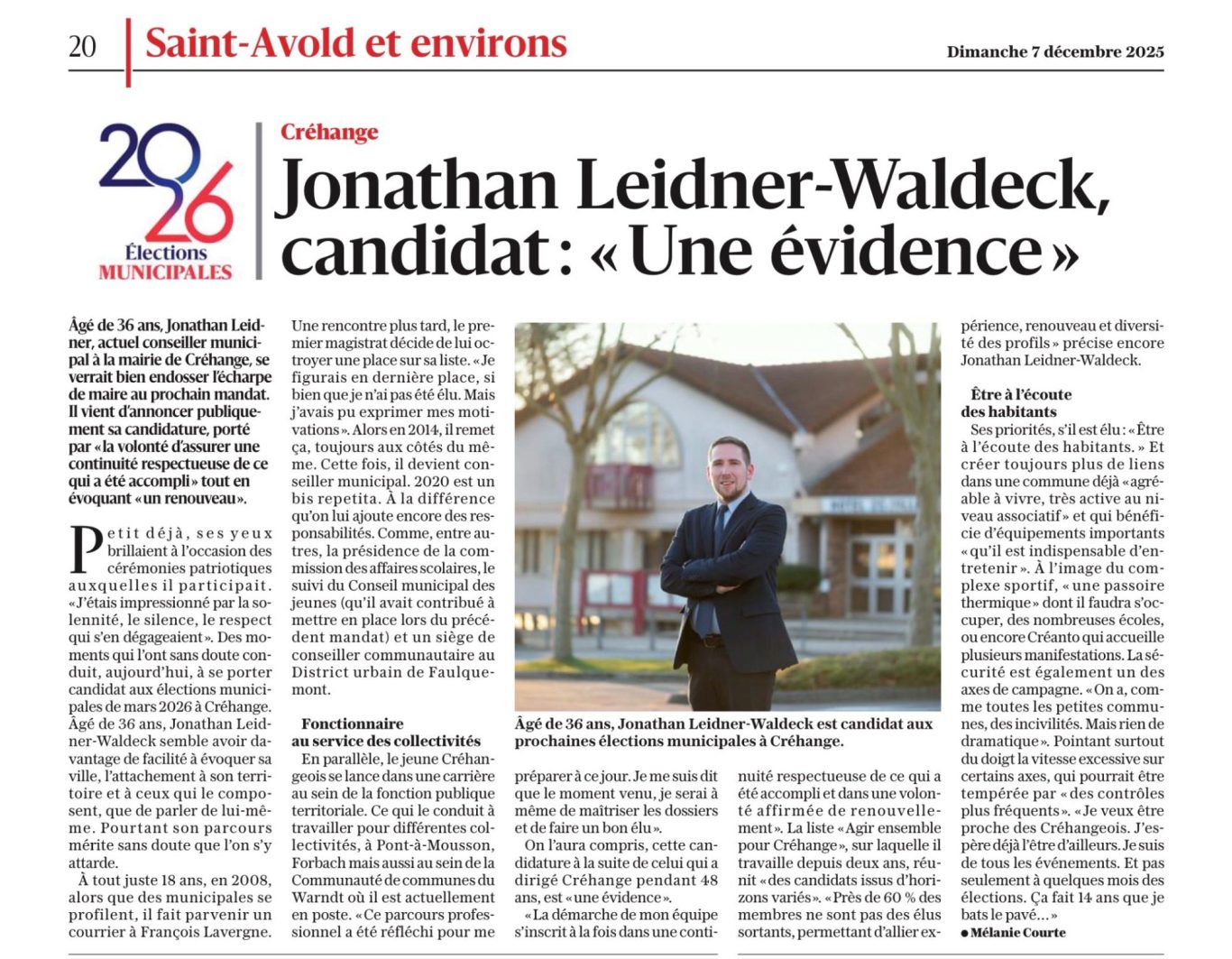 Votez massivement pour la liste Agir ensemble pour Créhange, avec Jonathan Leidner-Waldeck.