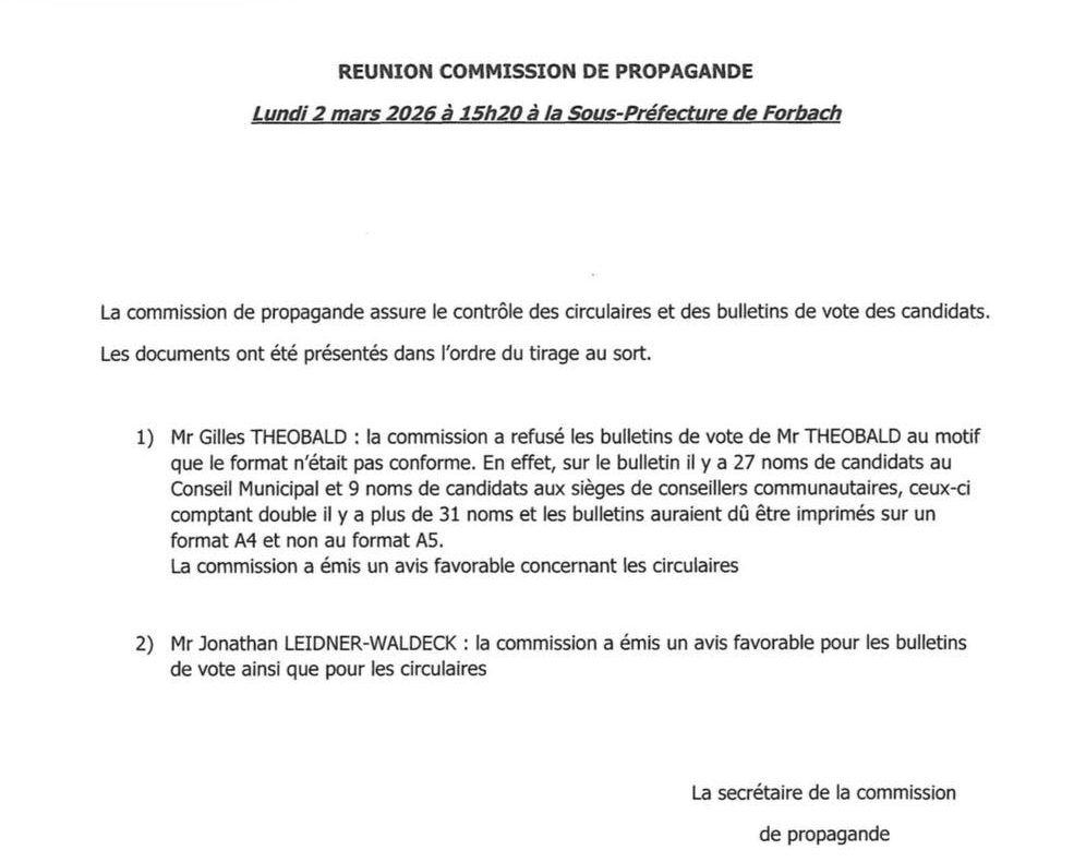 Seuls les documents validés par la commission de propagande réunie le 2 mars 2026 à la Sous-préfecture de Forbach sont distribués.